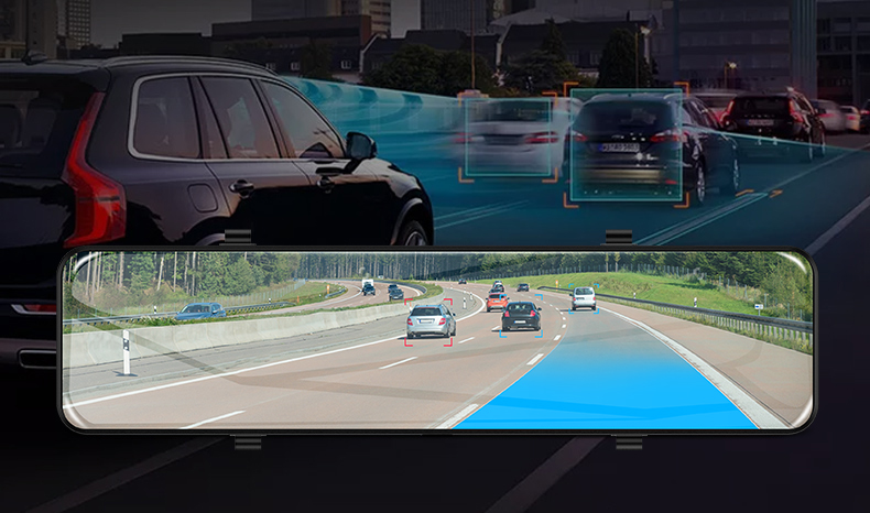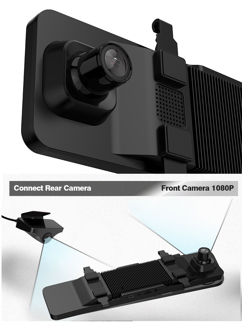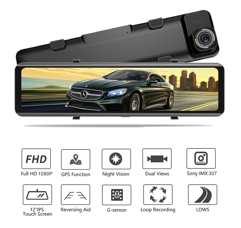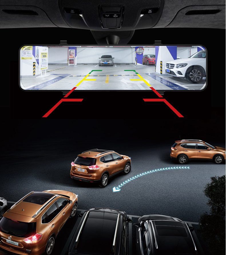 Зеркало со встроенным видеорегистратором Phisung S16 — съемка видео 4K 3840x2160p, Сенсор GC2053, угол обзора 160 градусов, уникальная ночная съемка, камера заднего вида Full HD 1080p, угол обзора 140 градусов, с разметкой парковки, Сенсорный дисплей 12" дюймов, одновременная запись видео на переднюю и заднюю камеру.